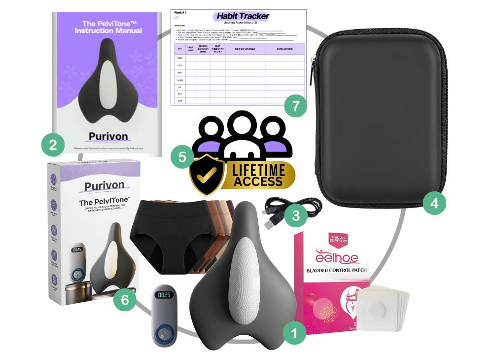 Free bonus gifts including Dr. Elaine Carter’s Nutrition Plan eBook, Lifetime Access to Purivon's Incontinence Support Group, Kegel Training Plan eBook, Kegel Video Course, and a Travel Pouch